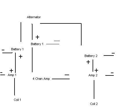 i dont understand everyone keeps explainnin this perfectly then u take it the wrong way i guess or u dont understand. you only need ONE ho alternator. you dont need 2 of them! just replace the stock one in ur car to a HO alt. and are u sayin hook an amp up to each voice coil since there dual voice coil subs? i've never heard of that. you'll only need one amp per sub or 1 amp for a pair of subs if u get a big enough amp. also you NEED a battery up front. there's no way around this you simply just need a battery under the hood!!! just hook the speaker amp up to one of the battery's u have in the back it wont matter which one. ok so does that make sense? you get a HO alt, the biggest battery under the hood that'll fit, and 2-3 battery's in the back.